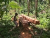 Zunächst radele ich auf wenig befahrener Straße durchs Kokospalmenhügelland. Wie schon öfter gesehen liegen auch hier Stapel von frisch gesägten Brettern am Straßenrand. Kettensägenlärm lässt mich anhalten und einen Gang hinein in den Palmenwald machen. Mit langen Motorsägen werden die Palmenstämme zersägt. Ohne Markierung und mit erstaunlicher Geschwindigkeit wird die Säge durch den Stamm gezogen. Ca. vier gleichmäßig dicke Bretter entstehen. Es ist billiges weiches Konstruktionsholz mit begrenzter Lebensdauer. Wenn die Nussernte nicht mehr ergiebig ist wird die Palme gefällt und der Palmenvorrat ist unerschöpflich.