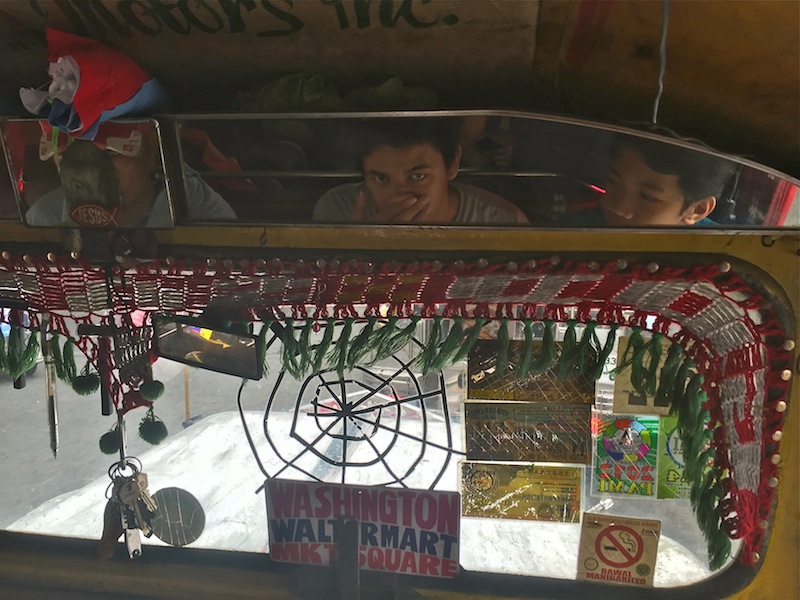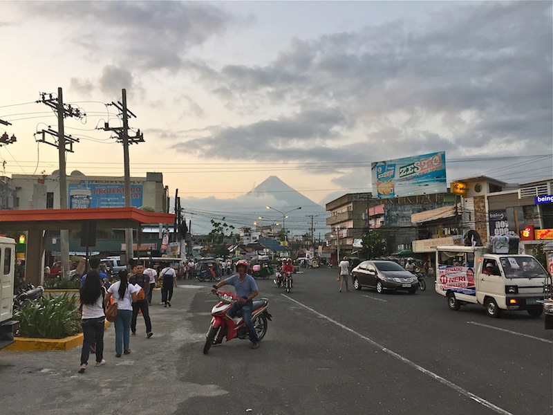 Es hoppelt ein wenig bei der Weiterfahrt, wird weniger und dann leider stärker. Beim Halt stelle ich fest, dass sich eine Lage vom Mantel gelöst hat und das Rad bei jeder Umdrehung in eine Unwucht bringt. Es ist aus mit dem Radfahren an diesem Tag. Nach längerem Warten hält endlich ein Jeepney. Die meisten sind vorbeigefahren. Wahrscheinlich ist ihnen die Radverladung zu lästig. Der Fahrer handhabt seinen Jeepney fast nur einhändig. Mit der anderen kassiert er, gibt Wechselgeld zurück und raucht. Er fährt sehr schnell, überholt, auch wenn er nichts sieht. Ich bin froh im nächstgrößeren Ort in einen Bus zu wechseln, der mich an mein geplantes Tagesziel bringt. Die Stadt Legazpi liegt am Fuße des 2350 m hohem Mayon-Vulkans mit einem wunderschönen symmetrischen Kegel.