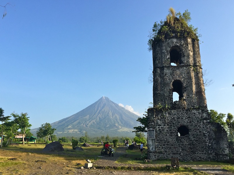 Die morgendliche Weiterfahrt startet mit einen Anstieg. Auf der Höhe angekommen liegt unter mir eine unerwartete Landschaft: Ein breites Tal voller Reisfelder und eine Nebelwand, hinter der eine Bergkette mit dem 1350 m hohen Vulkan Bulusan in einen blauen Himmel ragt. Aus kleinen seitlichen Kratern steigen Dampfsäulen empor. Die Hitze der letzten Nacht und der Anstiegsschweiß sind bei diesem Anblick vergessen.