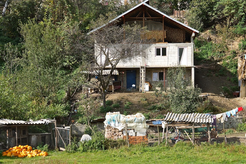 Ins tiefe Tal kann ich nicht schauen. Es gibt immer wieder Bergrücken, die umfahren werden müssen. Ich erreiche weit unten den Vidraru-Stausee, an dem sich die Straße in einem ständigen auf und ab über 20 km entlang schlängelt. Von der Staumauer aus kann ich noch einmal auf die Berge zurück schauen. Eine Meute von Straßenhunden kommt bellend auf mich zu. Kann sie mit meinem dog-dazer in Abstand halten. Sie verziehen sich mit eingezogenem Schwanz.