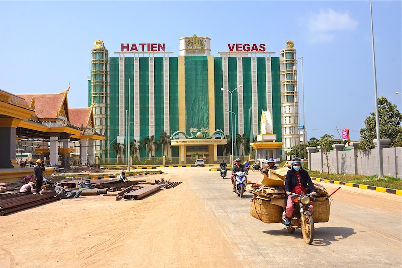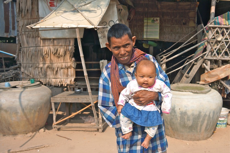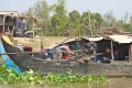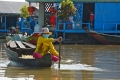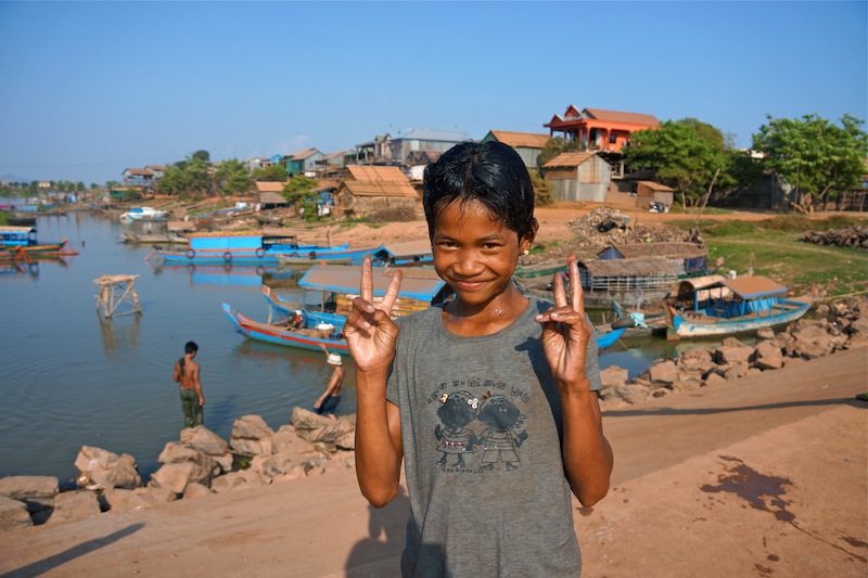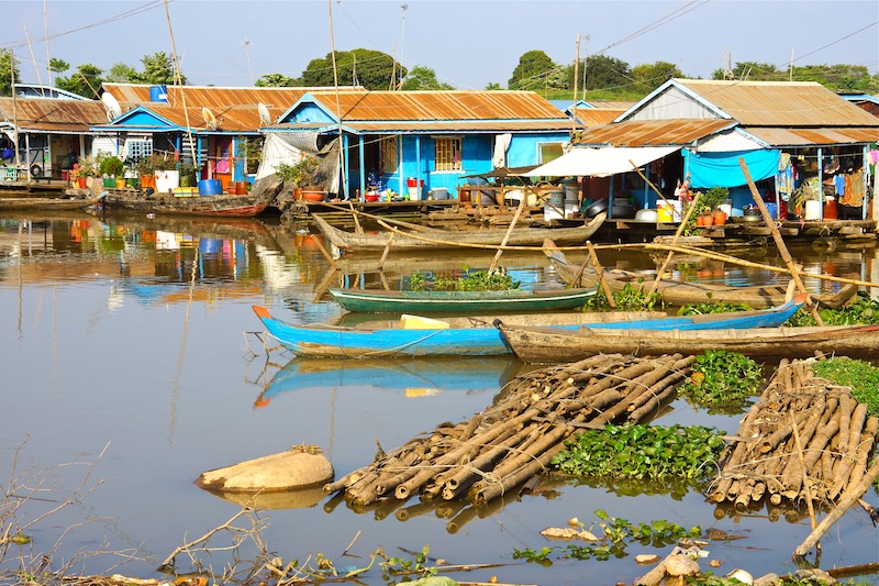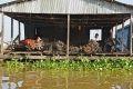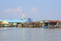 Nach 70 km im Ort Krakor beenden wir unsere Tagesfahrt. Ohne Gepäck fahren wir weiter zum fünf Kilometer entfernten Tongle Seeufer. Die Straße ist staubig, die Häuser am Rande sehr ärmlich. Mit einem Motorboot lassen wir uns in ein schwimmendes Dorf im See fahren. Die Infrastruktur ist perfekt. Es gibt eine Schule, die Schüler werden mit einem Boot eingesammelt, die in die Höhe ragende christliche Kirche lässt den buddhistischen Tempel klein aussehen, anstatt der vielen Mopedwerkstätten an Land gibt es kleine Schiffswerften. Touristen können in Homestays (Übernachtungen in der Familie) wohnen. Natürlich gibt es eine Krankenstation, Post und was sonst so benötigt wird. Die Haupteinnahmequellen sind der Fisch, der auch hier manchmal zum Himmel stinkt und Muscheln, die geknackt werden. Kleinere Muscheln werden in bis zum Rande gefüllten Booten ans Land gebracht, in Säcke gefüllt und auf Lkws verladen. Mir ist unklar, wie diese die Hitze überstehen und noch genießbar sind. In den Städten sehen wir oft die kleinen Muscheln, mit Soße mariniert, auf Karren zum Verkauf. Diese werden mit den Zähnen geknackt, ähnlich der Sonnenblumenkerne in anderen Ländern.