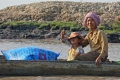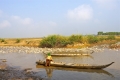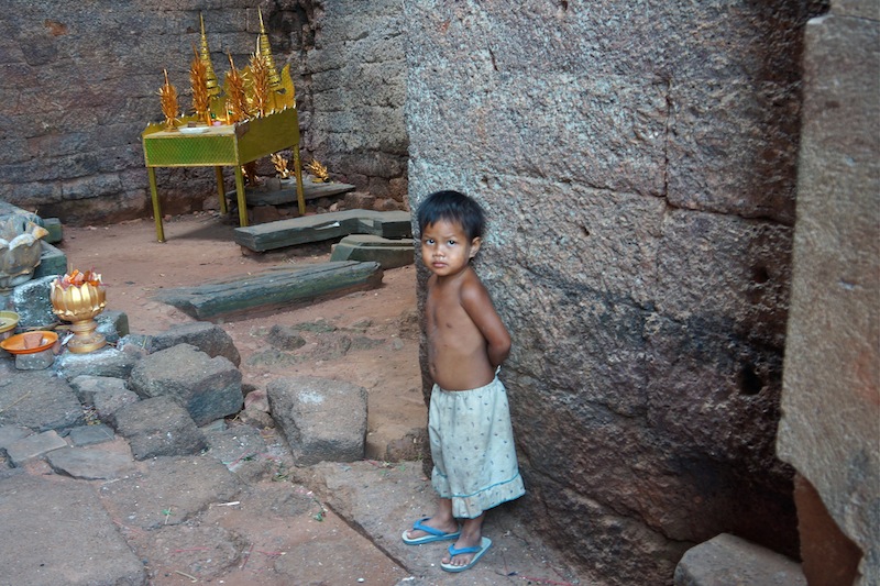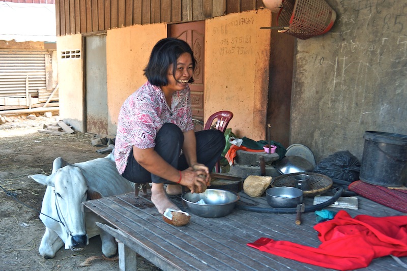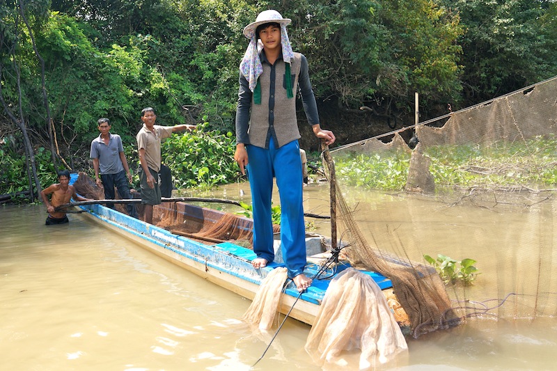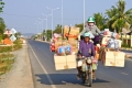 Die Hauptstraße verlässt den Fluss, wir bleiben am Wasser, auf kleiner unbefestigter Straße. Wir sind mitten drin in Fischerdörfern mit ihrer Geschäftigkeit. Der Eismann verteilt seine Ware, kleine Mönche sammeln Spenden, am Giebel eines Khmer-Tempels erfolgt der letzte Anstrich. Fische werden getrocknet oder der penetrante Geruch deutet auf eine Weiterverarbeitung zur Fischsoße hin. Vor und neben den Häusern stehen große Tongefäße als Wasserreservoir. Auf der einen Seite der Fluss, die Häuserreihe entlang der Straße und im Hinterland die abgeernteten Reisstoppelfelder. Für uns gibt es viel zu schauen, und auch wir werden bestaunt. Leider endet die Nebenstraße nach 30 km und wir legen das letzte Drittel der Tagesstrecke bis Kampong Chhnang auf der Hauptstraße zurück.