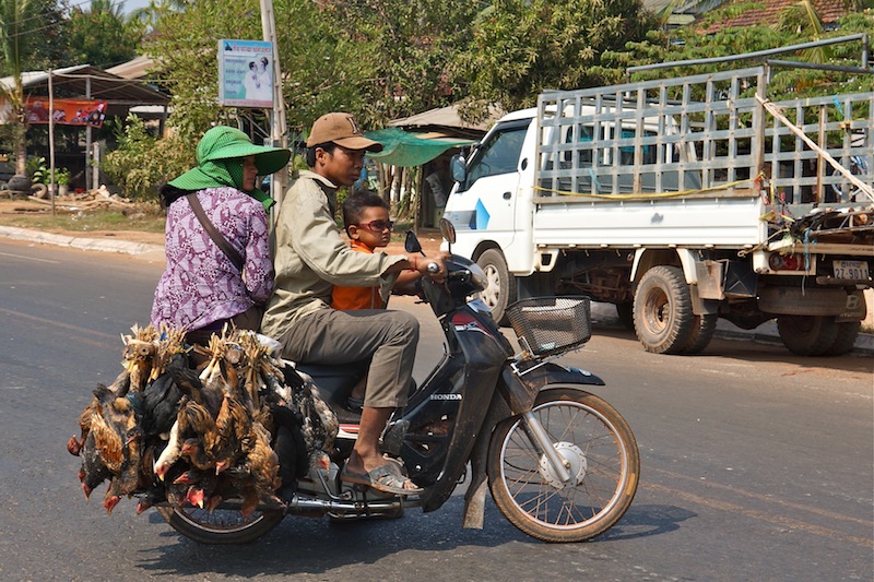 Nach wiederum einem frühen Start am nächsten Tag ist Marie trotz Morgenfrische bereits nach 10 km pitschnass geschwitzt und das Herz rast. Wir entscheiden, im nächsten Ort ein Transport zu finden und uns zum 120 km entfernten Battambang fahren zu lassen. Das ist eine gute Entscheidung, denn auf der Nationalstraße zu fahren ist kein Vergnügen und die Hitze kaum auszuhalten.